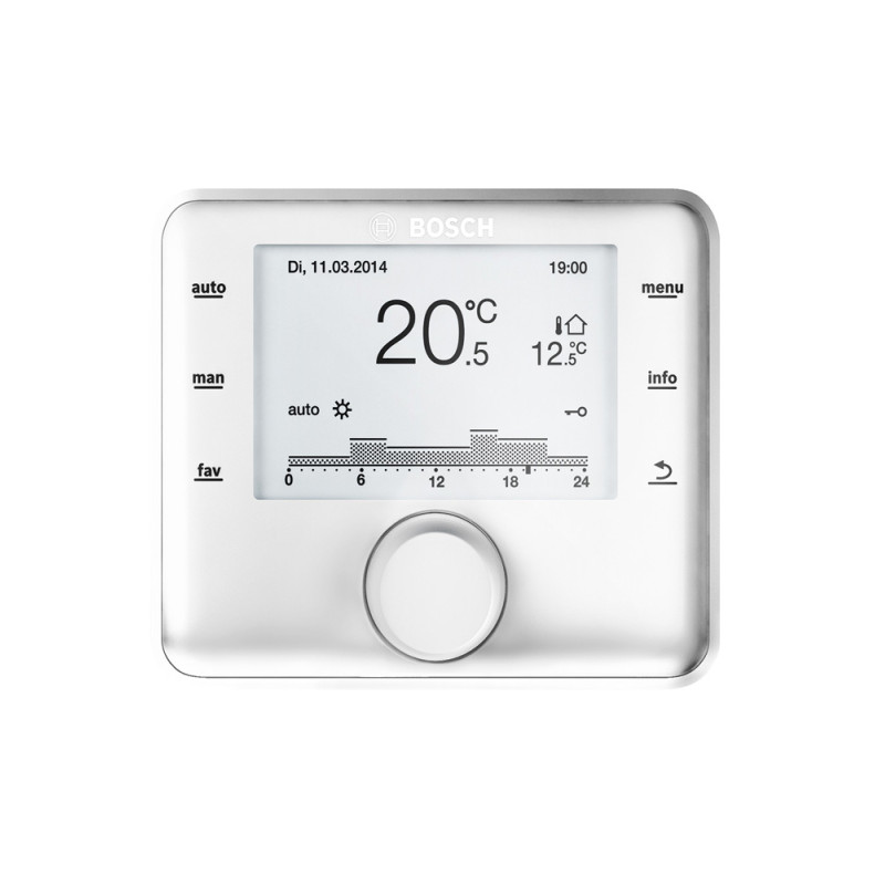 BOSCH CW400 оснащений інтуїтивно зрозумілим сенсорним екраном, який дозволяє швидко і зручно налаштовувати систему. Простота в користуванні робить цей пристрій ідеальним рішенням для тих, хто шукає комфорт та ефективність в управлінні опаленням. -